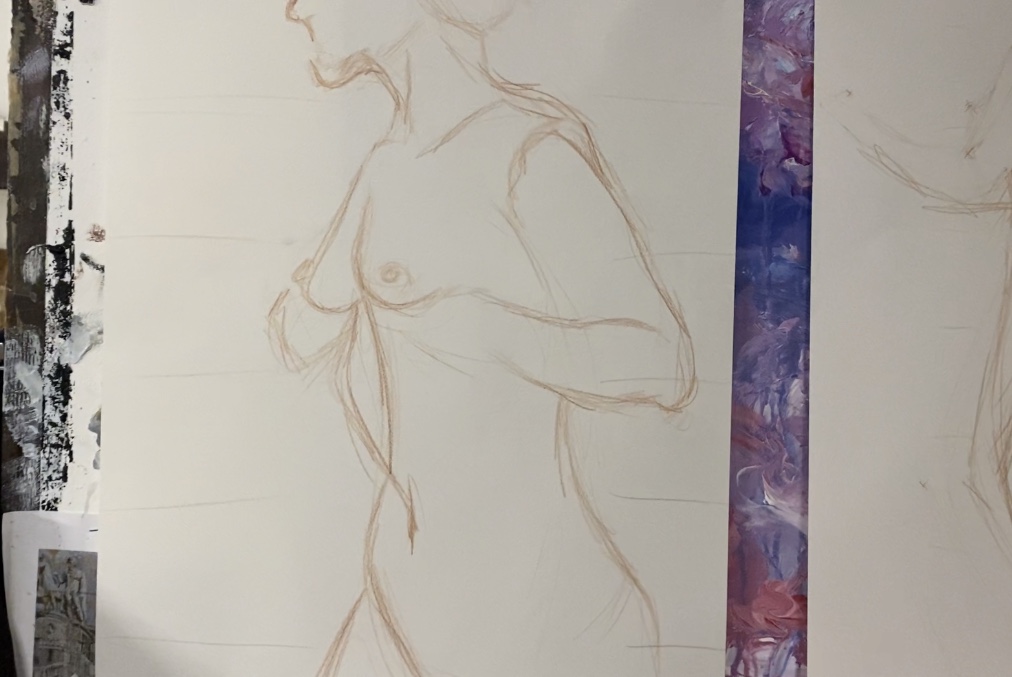 Isabella Binks described how students were encouraged to explore new techniques: "The first activity involved the group moving in a circle with each person adding to the next free hand drawing with a different coloured chalk." Freya Maxwell learnt new ways of working through a more controlled activity, using a gridded method to calculate the proportions of the model’s body. In another technique students used charcoal which was then smudged and drawn over in a cyclical process, she said. Student Helena Da Costa said she enjoyed the variety of materials used, such as willow, charcoal and rubber, which she has now added to her coursework.