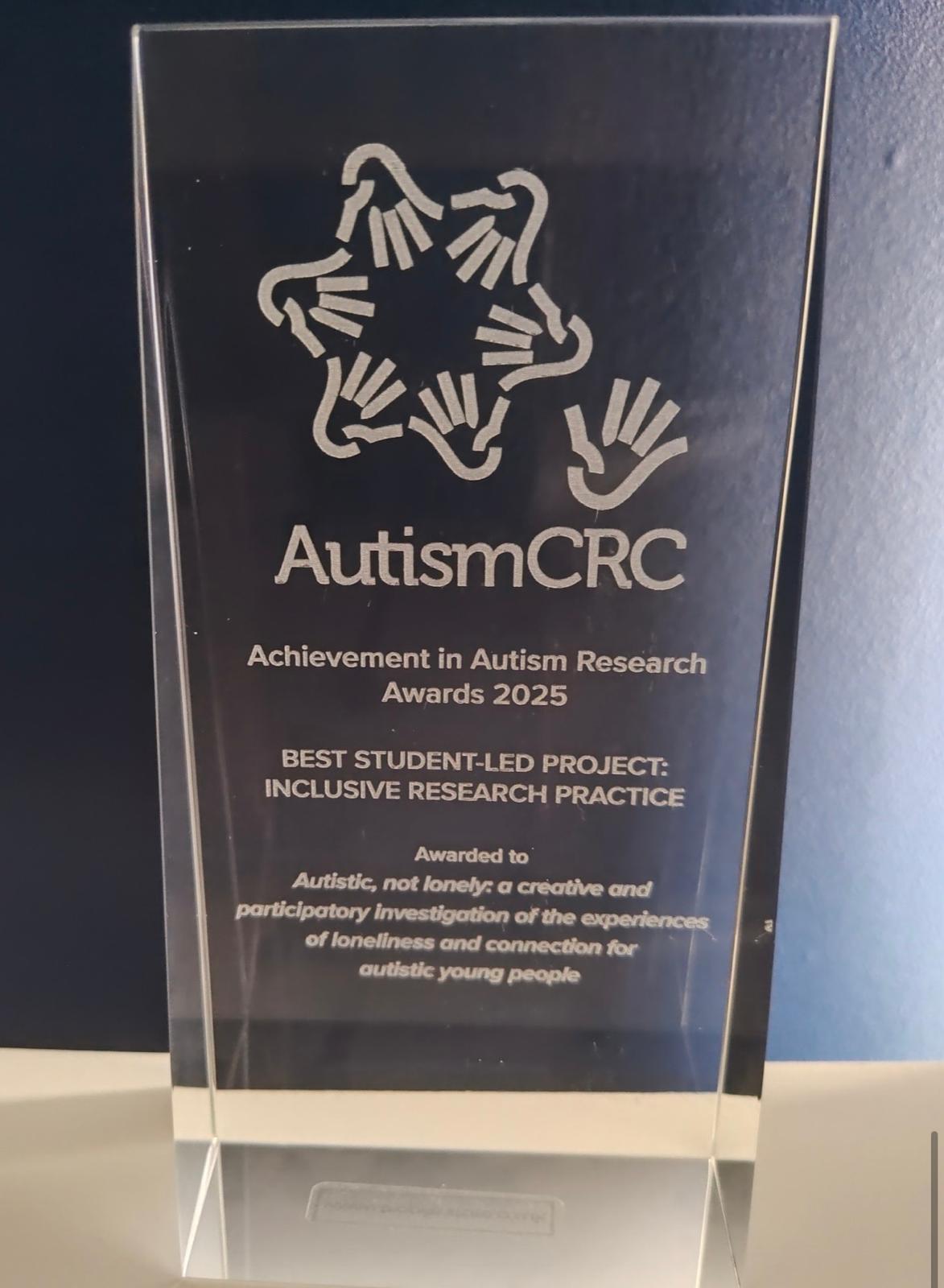 The award was presented by Autism CRC, the world’s first national cooperative research effort focused on autism, which said it had received a high number of applications both nationally and internationally, withaward winners demonstrating high levels of engagement with the autistic community.